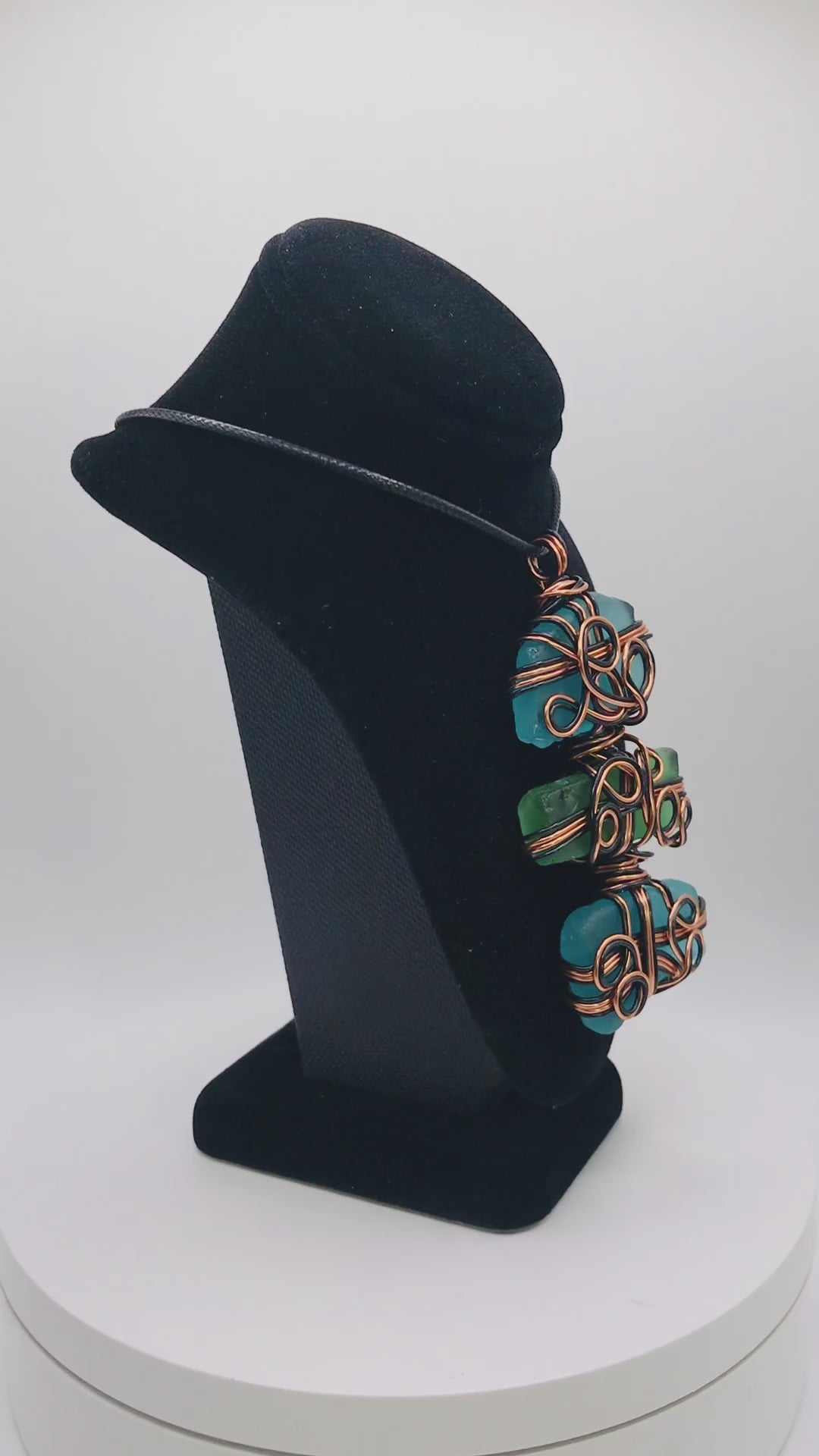 Sea Glass Multiwrap 3 Aqua Blue and Green Copper and Black Extra Large 2 1/2 + inch Pendant